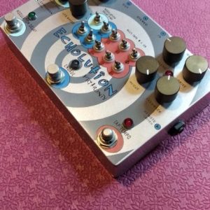 What truly sets the Echolution apart from most delay pedals are the Multi-Tap toggle switches which introduce any combination of five additional echoes at musical fractions of the master delay time. Chorus (pitch) and Tremolo (amplitude) modulation of the delay signal are controlled by a single analog LFO. Independent depth controls allow both types of modulation to be blended for rotary speaker sounds and other warped effects. An Expression pedal input for changing the delay time gives the musician even further stage friendly control over the Echolution’s time and pitch bending capabilities.