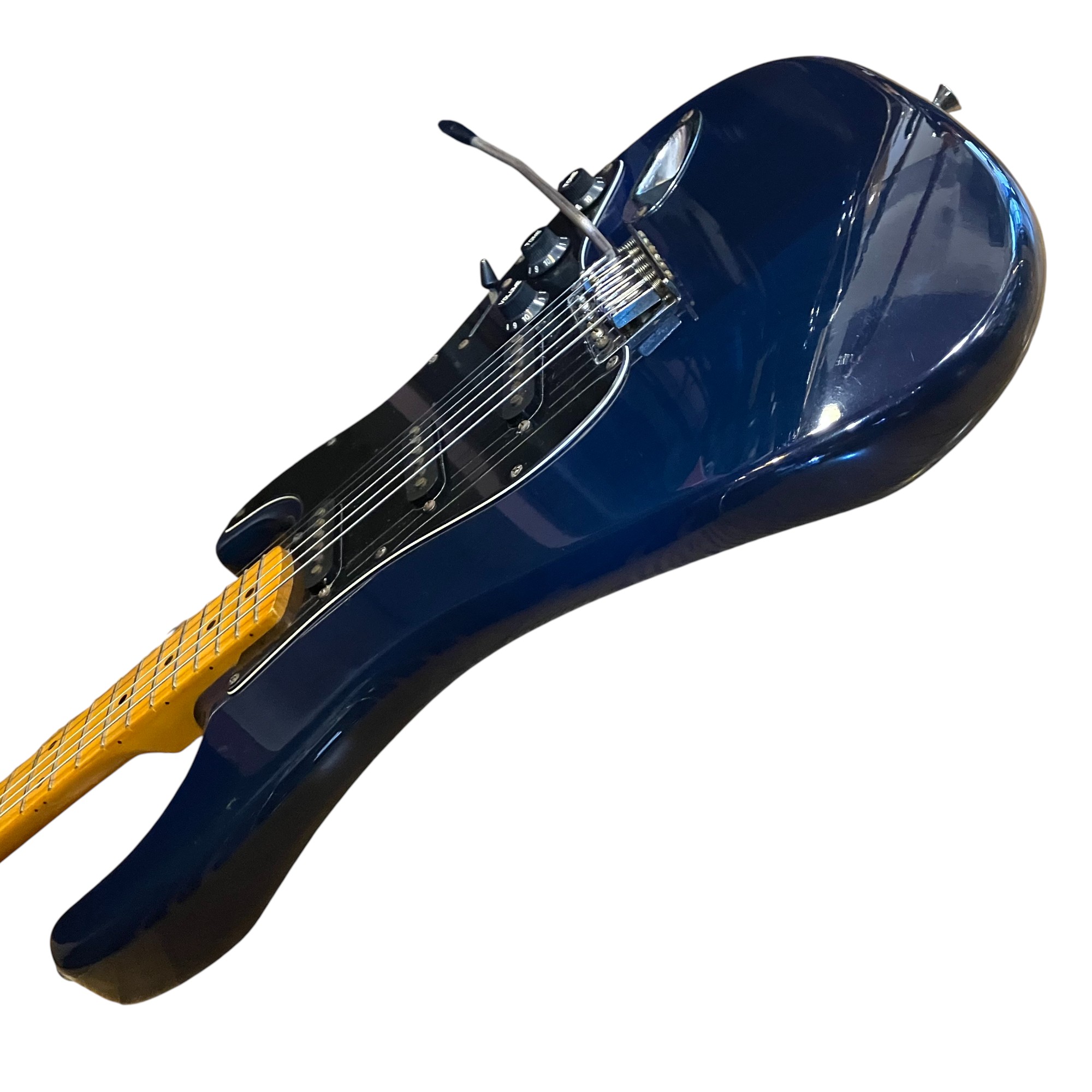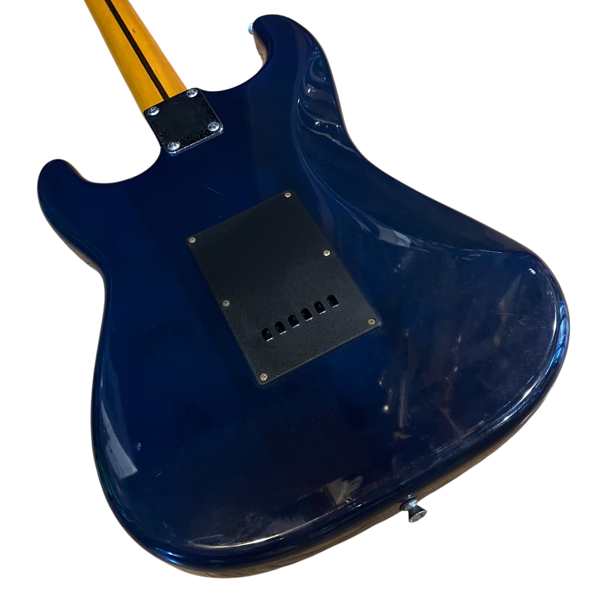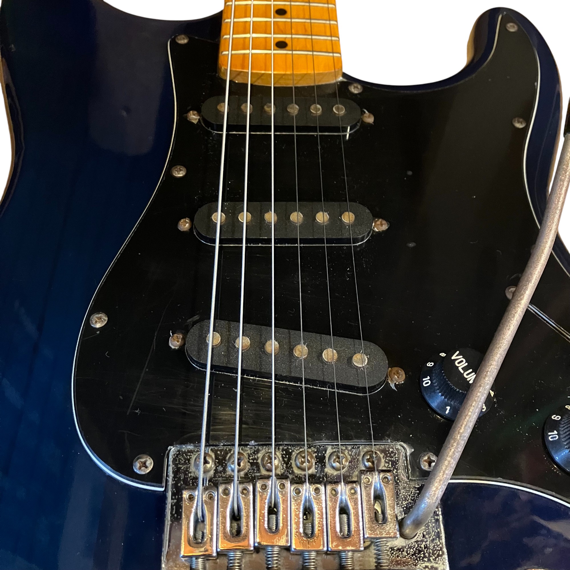 Body: Stratocaster-style, dark blue finish, black pickguard